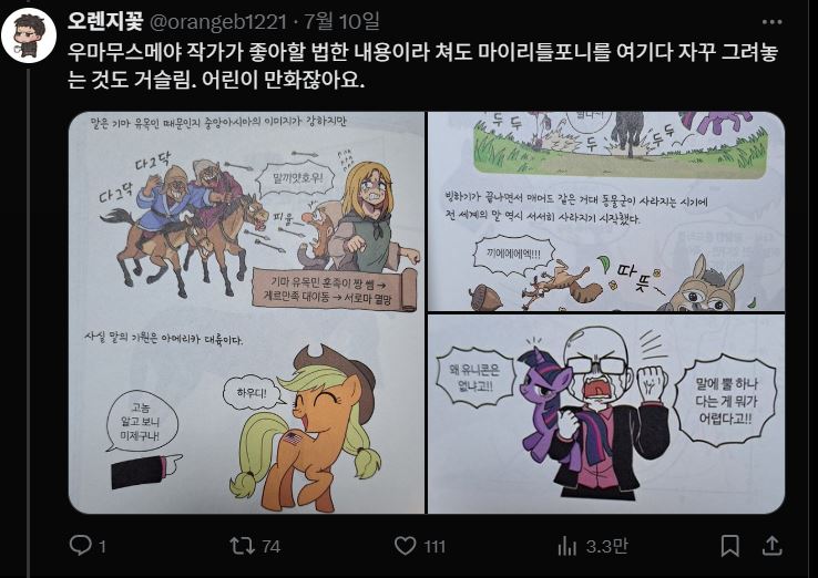 포니 그려놓은거랑 어린이 만화인거랑 뭔 상관임? 무슨 말을 하고싶은거임..?