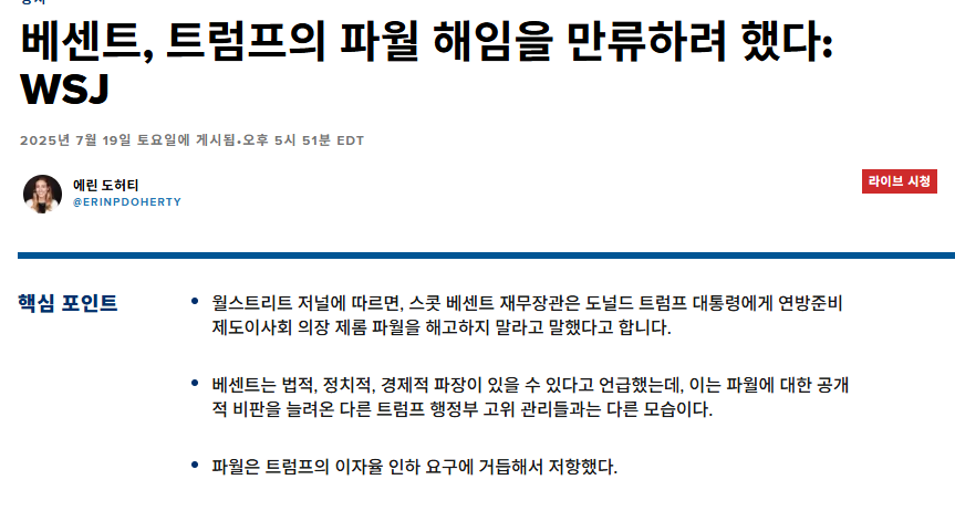 (파월이) 트럼프의 미국을 골로 안가게하는 최후의 보루라는 뜻인거같음 | 25.07.20 11:42 | | |