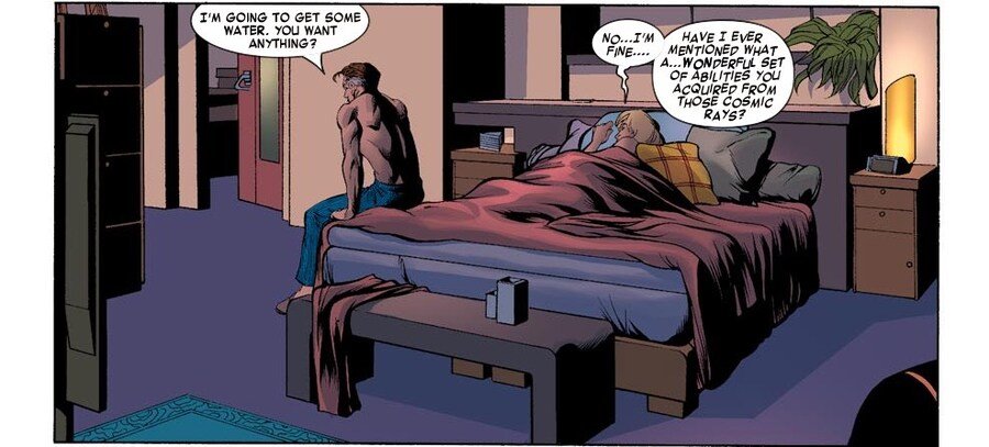 리드: 난 물 좀 마시러 갈건데, 당신도 뭐 갖다줄까? 수: 아니... 괜찮아... 당신이 우주 광선맞고 얻은 능력이 얼마나... 환상적인지 얘기한 적 있었나? 실제로 꽤 잘 사용하는