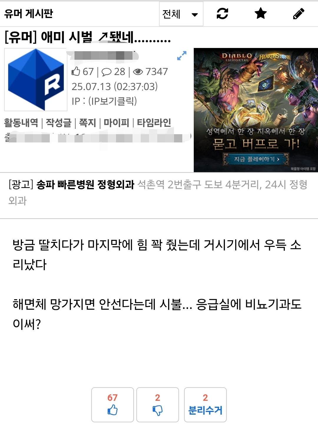 음 전봇대 넣다가 걸려서 실려오는 인간정도 아니면 감흥이 없는건가 | 25.08.06 21:11 | | |