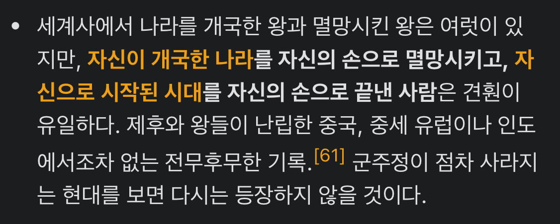 세계사에 다시 없을 업적이긴 해 아들에게 유폐도, 순수 무능으로 말아먹던가 혹은 찬탈자에게 뺏겨 죽는 것도 그런 비스무리한 건 다 있는데 건국자가 직접 적국에 붙어서 건국한 나라를 멸망시킴 워딩 존나 폭력적이긴 해