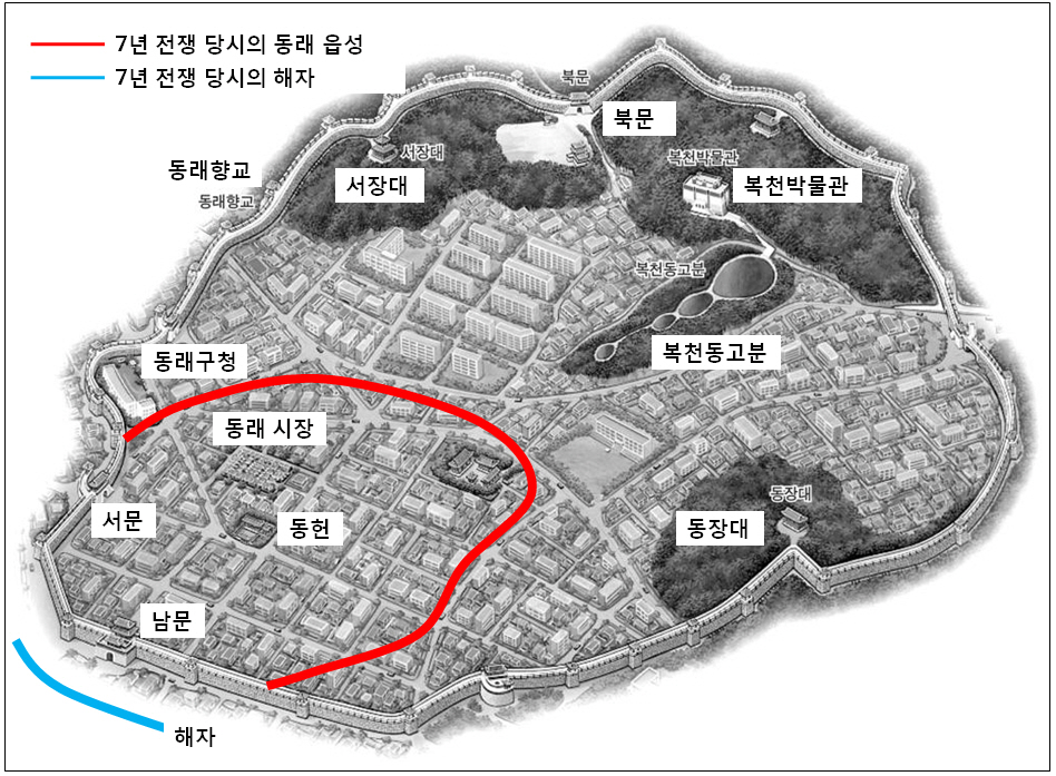 우리도 도시마다 성 있긴 했는데 동래성 그림인데 성 보이는건 조선 후기에 건설한거고 빨간건 임진왜란 당시에 동래성 저 빨간색에서 일본군 상대로 버티다가 점령당하고 학살당함.. 땅 파보면 유골들 많이 나온다더라