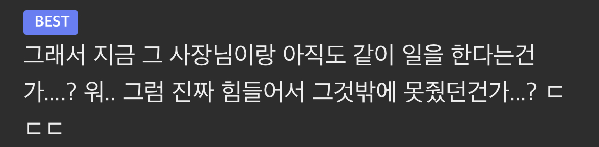 그래서 지금 그 사장님이랑 아직도 같이 일을 한다는건가....? 워.. 그럼 진짜 힘들어서 그것밖에 못줬던건가...? ㄷㄷㄷ