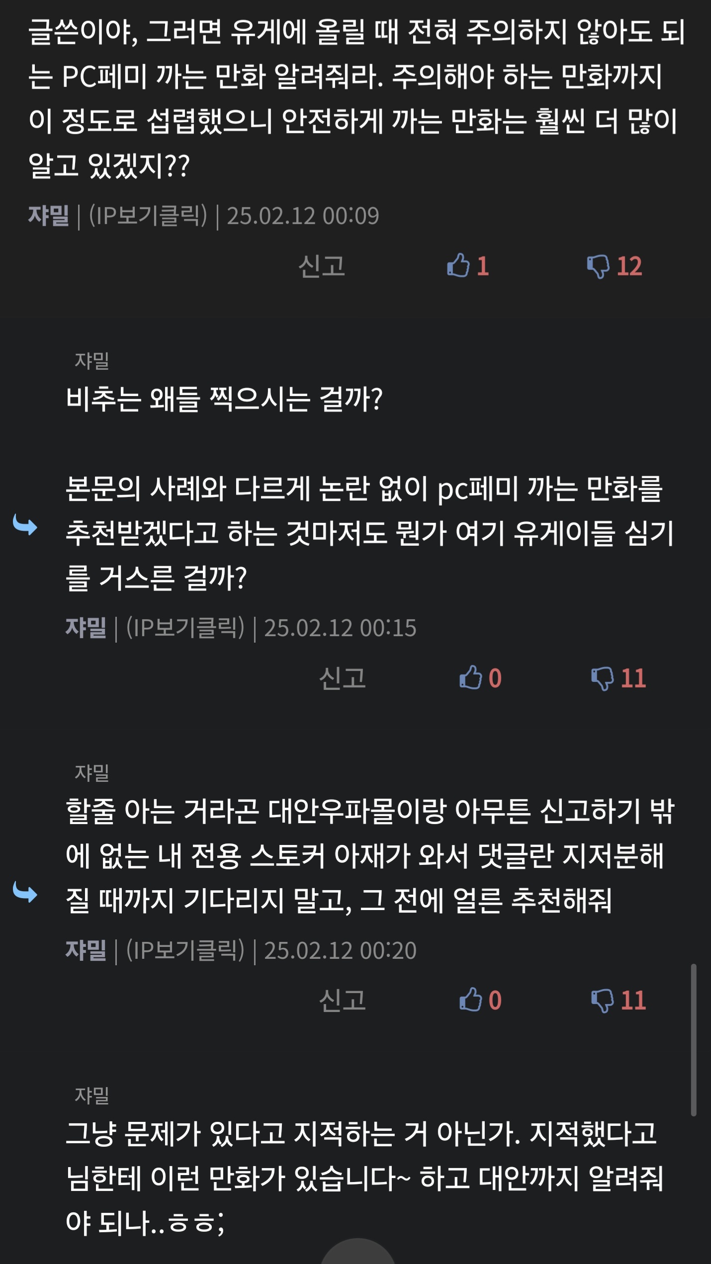 그러니까 PC 까는 만화이면서 무난한 거로 추천해달라는 게 왜 비추까지 받을 일이냐고 내가 묻잖아. 모르면 그냥 모른다고 하거나 아님 댓글을 안 남기면 됐지 왜 비추를 때렸냐고... PC까는 만화 자체가 올라오는 게 싫은 게 아닌 이상 비추 먹을 이유가 없잖아, 안 그래? 설명해봐 | 25.08.24 13:19 | | |