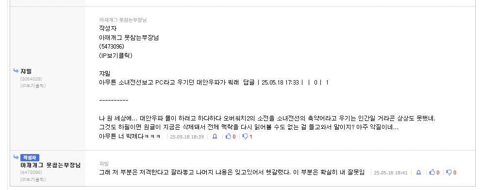 ㅇㅇ 니가 계속 pc 맞고 이건 변한적 없음. 맘대로 규정&강요도 딱 니가 하고있고. 받아들이기 힘들지? 시간이 약이다. | 25.08.24 13:36 | | |