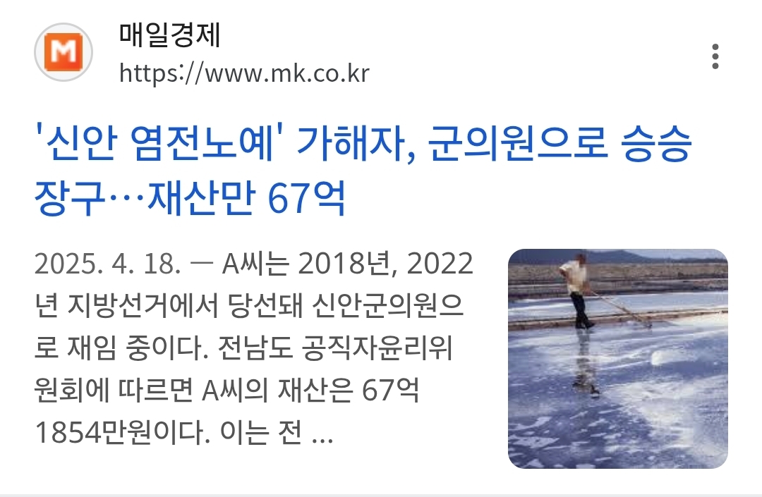 신안 염전이 무서운건 어디선가 쳐와서 타지역 언급하면서 신안 만의 문제가 아니라고 물타기 하는거 신안은 진심 지들이 당당하다는것을 중국 동북공정 마냥 준비하고 있더라.