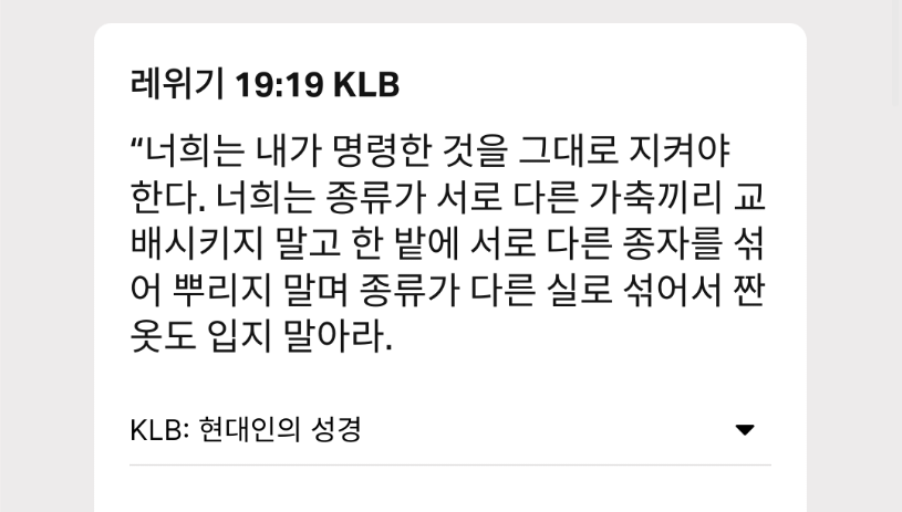 너희는 종류가 서로 다른 가축끼리 교배시켜서는 안 된다. 너희 밭에 서로 다른 두 가지 씨앗을 뿌려서는 안 된다. 서로 다른 두 가지 옷감으로 만든 옷을 걸쳐서는 안 된다. 이거만 보면 남의 집 아내와 불륜하지 말라는 소리 같기도 하고 | 25.09.11 17:35 | | |