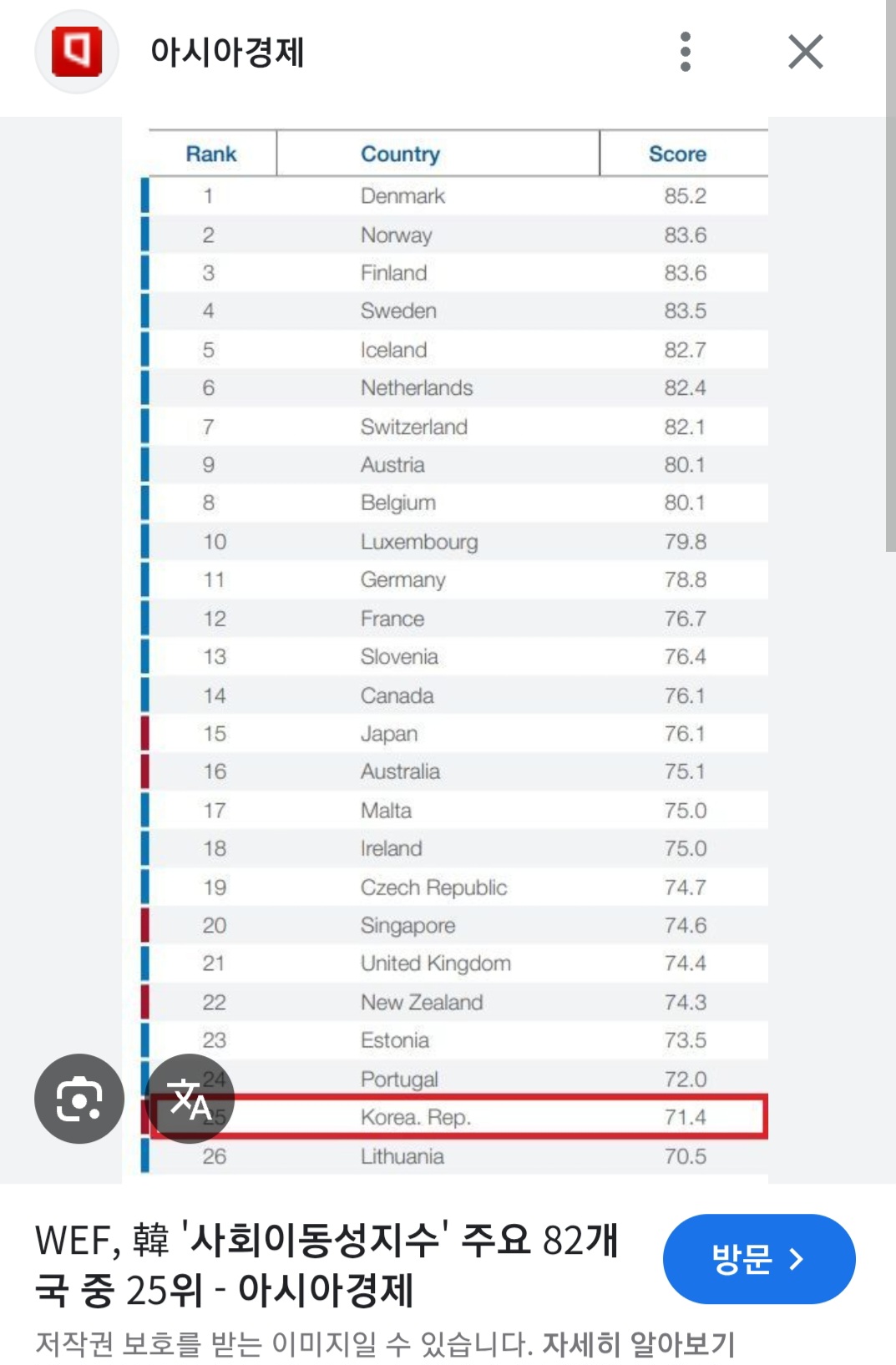 보건 부문 91점을 받아 9위 기술 접근성(92점·3위) 근로 기회(79점·17위) 교육 접근성(76점·24위) 교육의 질 및 공평성(76점·29위) 포용적 기관(74점·25위) 평생학습(68점·14위) 노동 조건(61점·36위) 사회적 보호(55점·45위) 공평한 임금 분배(42점·56위) | 25.09.21 04:07 | | |