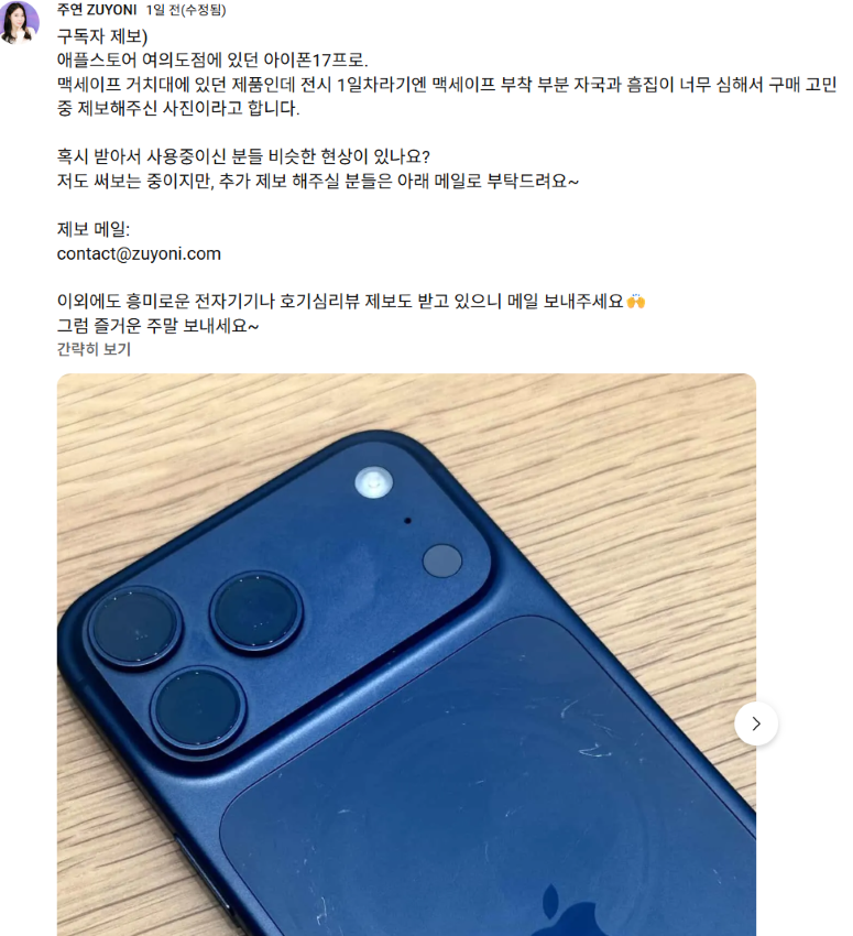 맥세이프 자석 자력이 상당해서 큰 규모 기업 제품중에도 저런 불량이 종종 나오긴해 | 25.09.21 17:30 | | |
