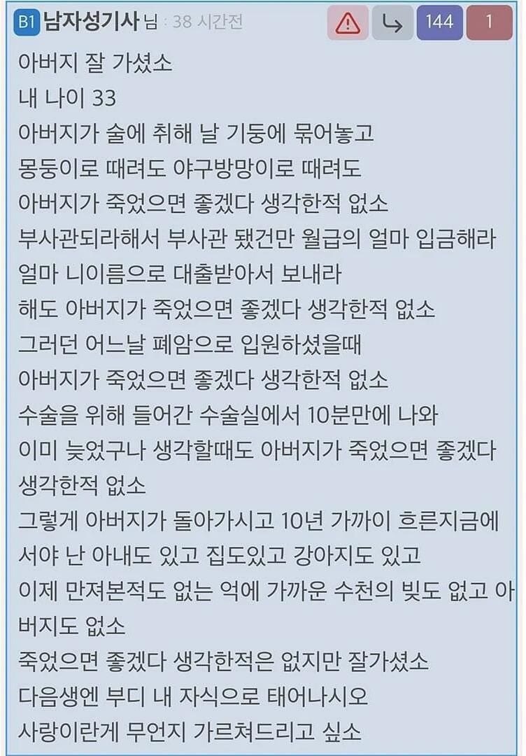 나도 27살때 경찰이 갑자기 찾아와서 아버지가 돌아가셨더고 했을때 엄마랑 둘이 끌어안고 좋아했음. 근데 떠난사람 떠나고 그사람이 망쳐놓은 집 주인은 무슨죄인가 싶어 뒷정리 하러가니까 좀 불쌍하더라. 사람마음 참 신기해 그러고나선 그인간 가계에 심각한 심장질환이 있단걸 알게되곤 이인간은 가고나서도 도움되는게 없다는 생각으로 바뀜 ㅋㅋㅋ 시발 지금도 2년마다 병원간다... ㅆㅂ 매번 뒤지게 쳐맞고 병원 실려가면서 저주 미친듯 했는데 끝까지 도움이 안되 제발 지옥갔길