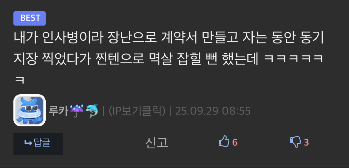 내가 인사병이라 장난으로 계약서 만들고 자는 동안 동기 지장 찍었다가 찐텐으로 멱살 잡힐 뻔 했는데 ㅋㅋㅋㅋㅋㅋ