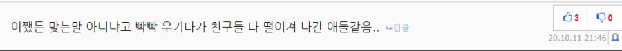 손절 할거면 빨리 하던지 끝까지 친구로 데리고 갈거면 이런거 보여주면서 너같은 애들이 이런 취급 받는다 이게 니 말투 특이다 고칠 기회를 줘야함. 저런거 줘도 지랄만 하고 너랑 다른 친구가 우쭈쭈 해주고 받아주기만 할거면 그건 친구 관계가 아님. | 25.09.30 13:32 | | |