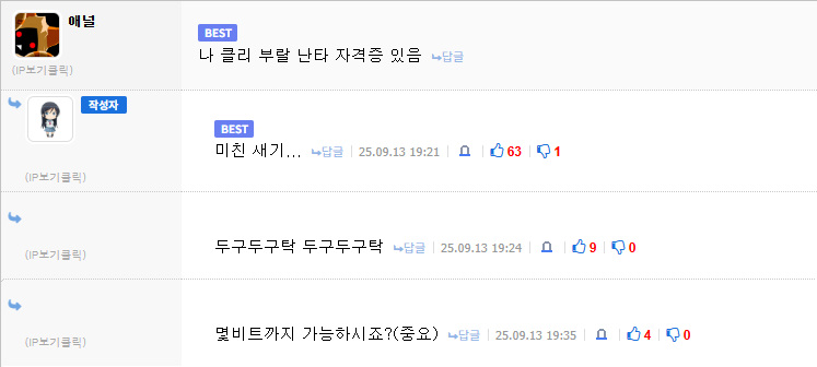 그도 그럴게 여자들은 친구들끼리 서로 남친ㅅㅅ 물어보고 공유하니까.. 남자들은 그갈 타부시하고.. | 25.10.04 03:12 | | |
