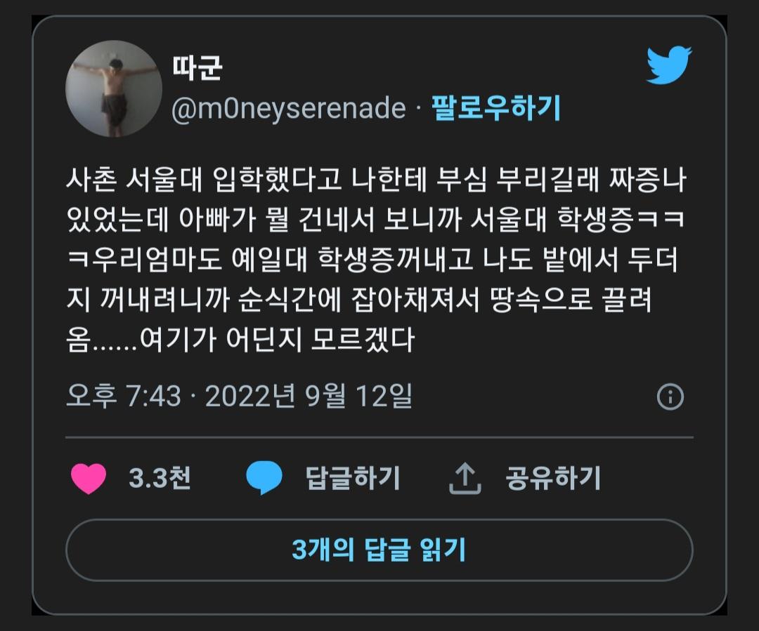 그래 서울대 들어왔으니 얼마나 스스로가 자랑스럽겠어.... 주변에서도 헹가래 해줬을 거고 귀엽네