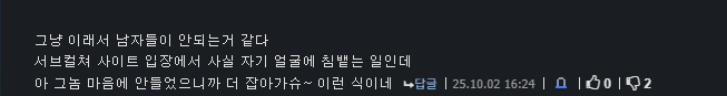 진짜 여러모로 대단하다... 갈수록 심연으로 가네 유게에서 닉네임 원하지 않는데 기억해버리게 된 몇 안되는 놈.. 제발 원종이만 되지 말길... | 25.10.07 22:21 | | |