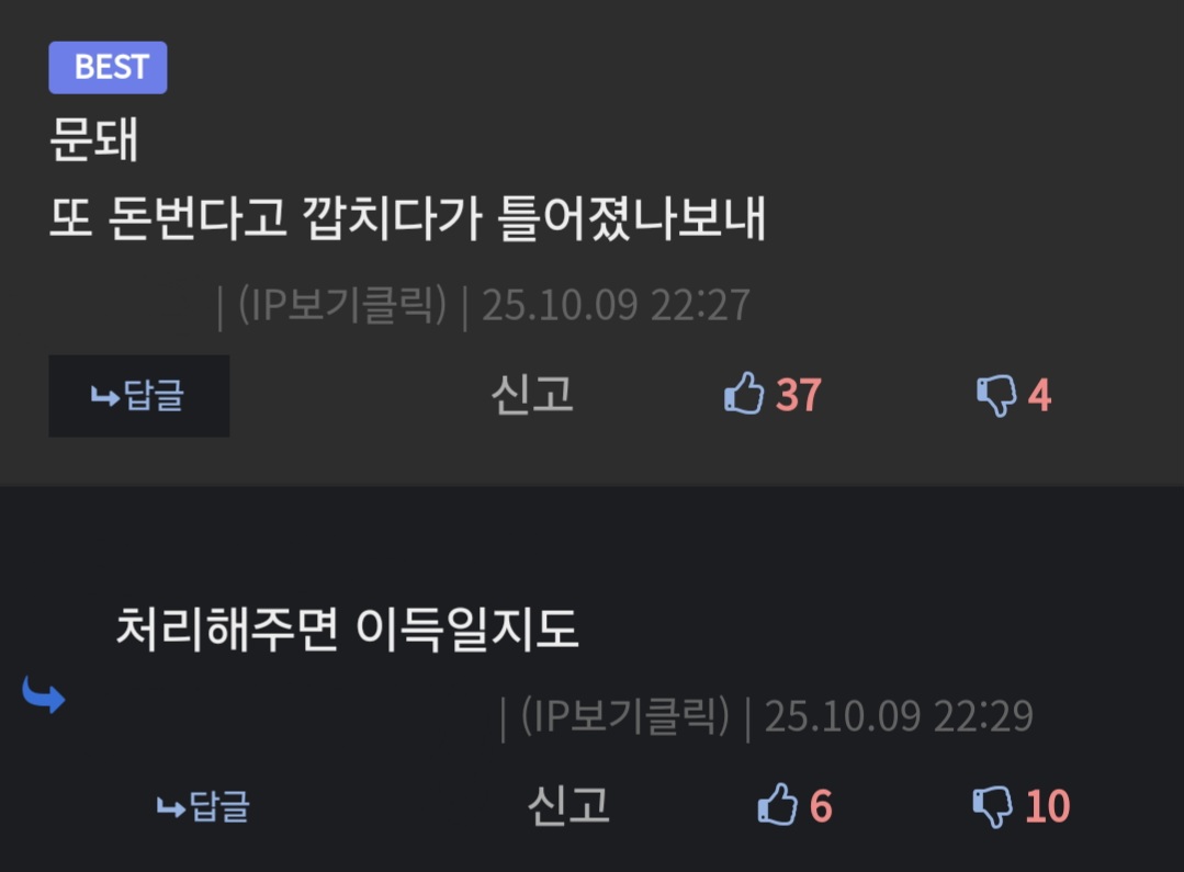 이거였는데 대댓글은 한발 나아간 더 미친소리인데 거기도 추천이 막 박히고 | 25.10.09 23:20 | | |