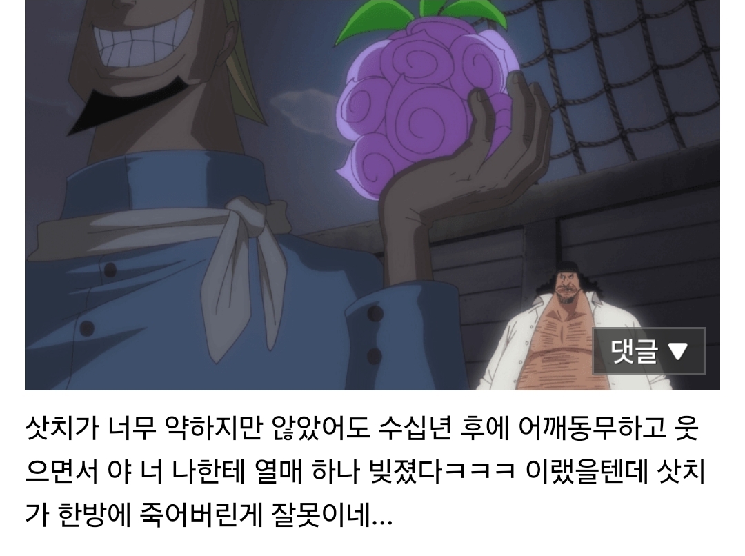 지금 생각해보면 티치도 카이도처럼 반쯤 장난으로 퍽치기 하고 열매를 뺏어먹었은데 돌아보니 사치가 죽어있었던 걸지도...