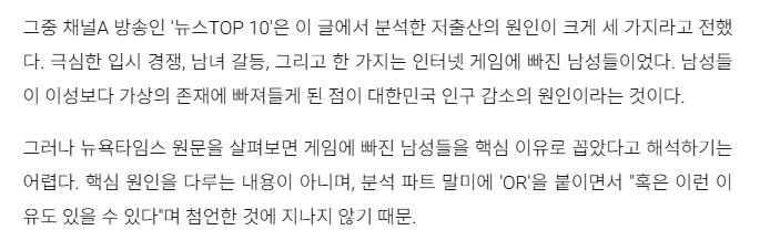 뉴욕타임스 가서 원문 봤는데 일단 기고문인거고 Or that the country has long been out on the bleeding edge of internet gaming culture, drawing young men especially deeper into virtual existence and further from the opposite ㅅㅅ. 에서 Or ... 이런걸지도 이런 느낌으로 첨언한거고 주요 요인은 아님. 게임에 관련된 문장은 이게 끝임 | 25.10.11 09:56 | | |