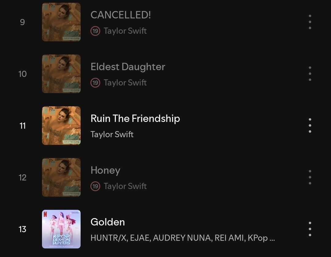 이번 테일러 스위프트 곡들이 골수팬들 사이에서도 불호가 꽤 있는 걸로 봐선 1위 재탈환도 영 현실성 없는 전망은 아닙니다. 기존 인기에 힘입어 재빠르게 차트를 석권하긴 했지만, 답지 않게 수위 높고 얄팍한 가사나 앨범 전체 퀄리티의 하락 등 좋지 못한 평가가 SNS에서도 꽤 돌아다니더군요.