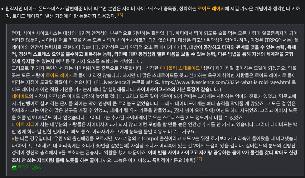 렐릭이 v를 조니실버핸드로 덮어씌우는중이라 뇌에 계속 영향을 줘서 사이버사이코를 피하게 되는 효과가 있던게 아닐까싶음.. 머리에 총알 박히고 산것도 그것덕분이랬던가.. 아니면 강제로 서로의 기억을 가진 이해자가 생긴 덕분일려나.. | 25.10.11 14:05 | | |