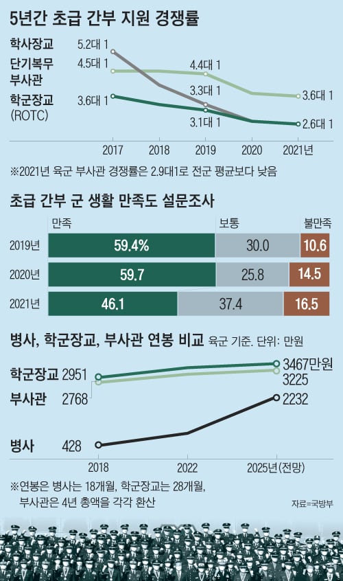 최근 3년 동안 재임용된 장교와 부사관의 절반가량은 장기복무자로 선발돼 근무하고 있습니다. 취업이 어렵다 보니 병사로 의무 복무를 하다 직업 군인이 되기 위해 하사관에 지원하는 현역 부사관제 신청자도 갈수록 늘고 있습니다. 국방부는 이와 함께 전투나 작전 도중 부상으로 다친 병사를 부사관으로 채용할 수 있도록 법령을 바꿔 이번 달부터 시행한다고 밝혔습니다. | 25.10.11 19:15 | | |
