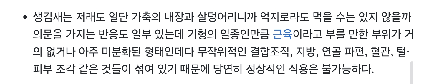 근육이 없어서 정상적인 섭취가 불가능하다네 갈라봐야 털 많은 피부와 뒤섞인 내장과 일부 뼛조각같은거밖에 없을거라고... | 25.10.11 19:50 | | |