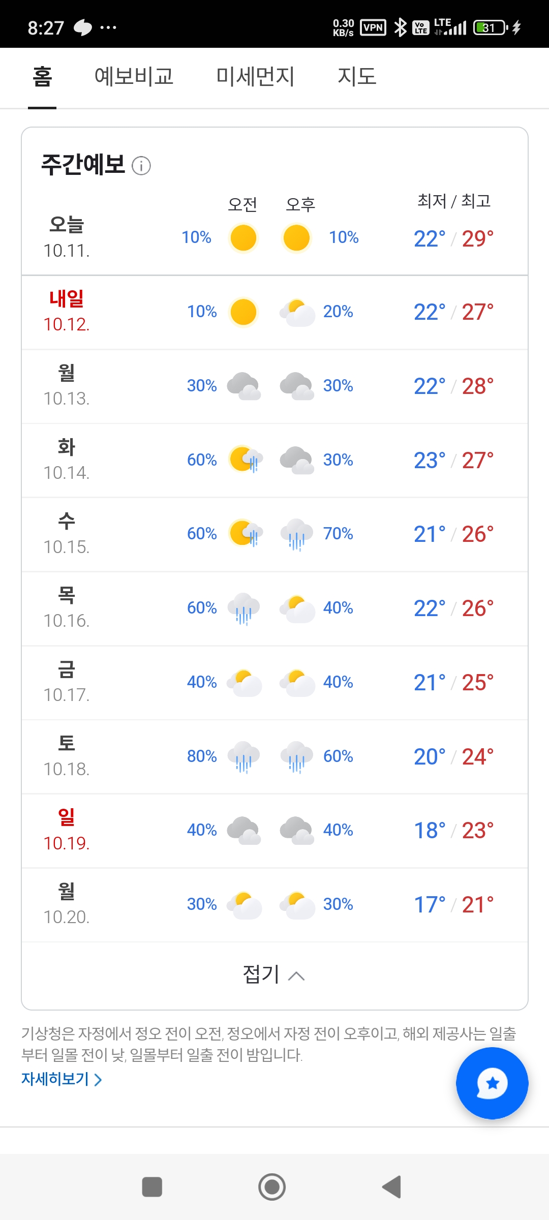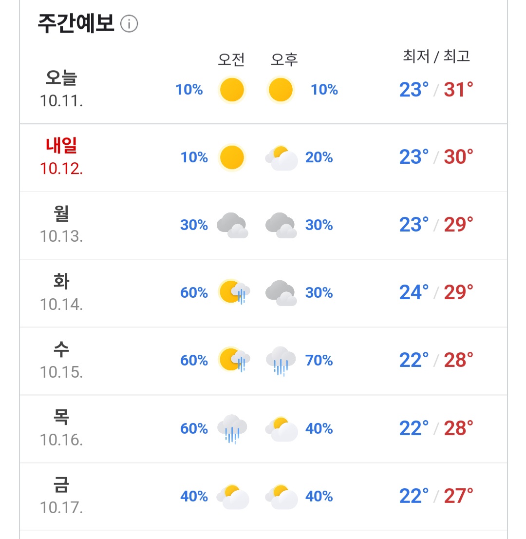 요즘은 오히려 장기 날씨는 잘 맞추고, 당일이나 하루 이틀 정도의 세부 날씨를 못 맞추더라... 뭐 강수량 같은 거 | 25.10.11 20:22 | | |