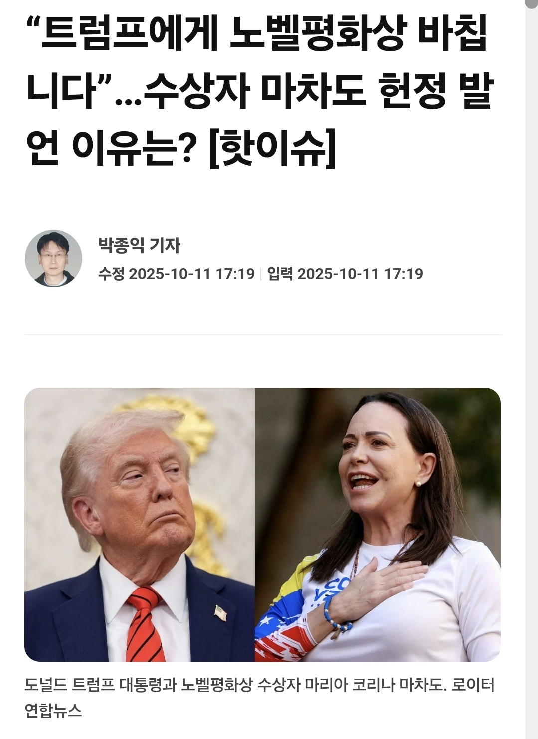 문제는 트럼프가 지금 추진하고 있는 베네수엘라 군사개입이긴 하지 그것까지 가버리면 마차도도 트럼프를 지지할 수 있냐가 문제라서 | 25.10.11 20:14 | | |