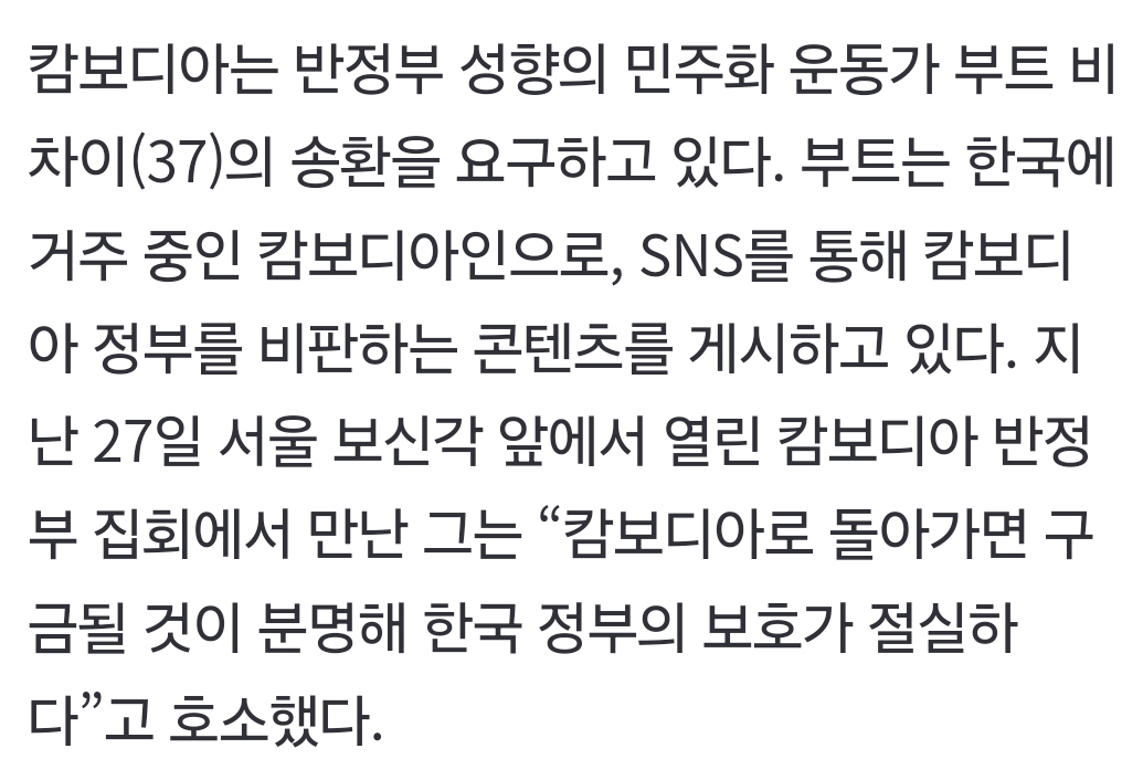 우리나라에 캄보디아 반정부 인사가 있었나...? 저기 정부도 참 이상하게 플레이하네.