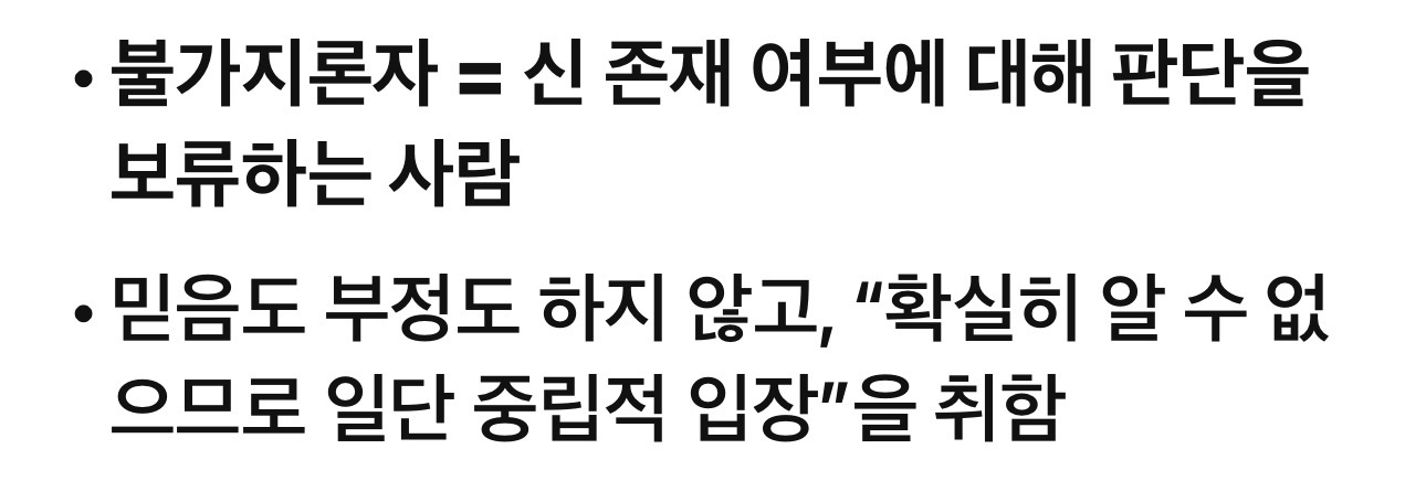 어찌보면 중립이라 말할 수 있지만 지금 인간들이 믿고 있는 각종 종교들은 절대적으로 믿지 않지. 중립 이라는건 단지 ‘신의 존재 여부‘에 대해서만 중립. | 25.10.12 15:22 | | |