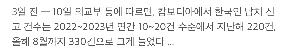 국내 540건은 미해제 수이고 캄보디아 330명은 실종자가 아니라 납치 피해자 수네요. 단순 실종까지 더하면 더 불어나겠네요. | 25.10.12 22:57 | | |