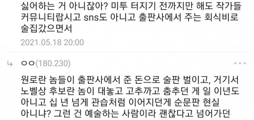 유동이 말하는 중간에 출판사 돈으로 술 처마시러 간다는 말이 있으니까. 고은도 미투당했는데 조용해지니까 다시 즈그들끼리 빨아주기 시작했거든. | 25.10.13 13:14 | | |