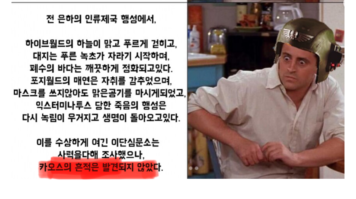 이 상황이 암만 봐도 개 ㅈ된 거지 뭐가 아니야! 임페리움과 우주 전체가 집나간 황제 인간성이 예전에 버린 선물 보따리 들고온 거 마냥 ㅈㄴ 회광반조 하고 있잖아 | 25.10.13 15:22 | | |