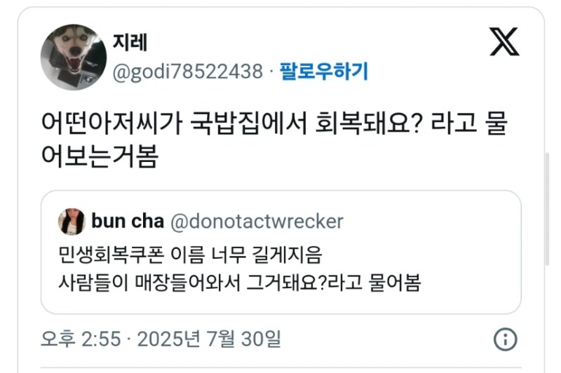 ??? : 여기 민생회복되나요? 문에 붙이고 들어오는 카운터에도 써 있는데 물어보더라 | 25.10.14 13:14 | | |