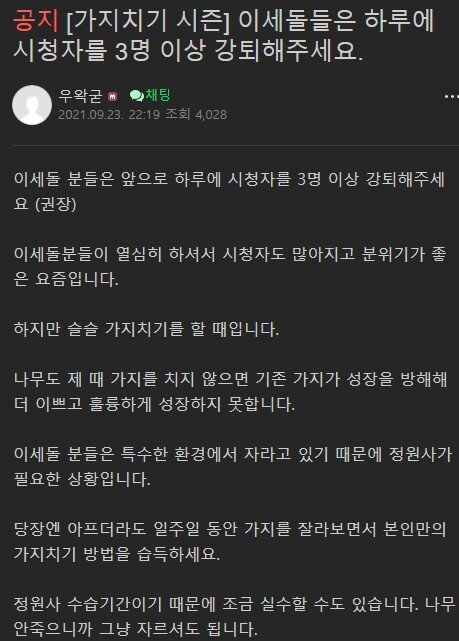 ??? : 의무적으로 하루 3명 가지치기하세요, 가지를 쳐야 팬덤이 건강합니다(실제로 한 말) | 25.10.14 13:29 | | |