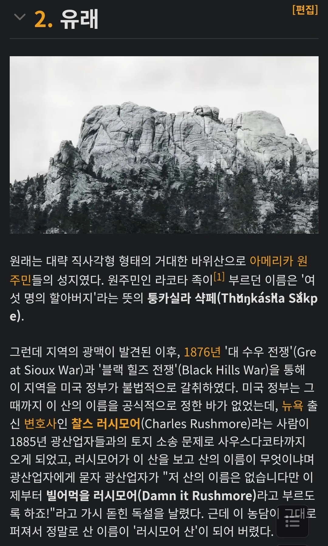 내가 알기로 저 산이 예전 미국 원주민이 살때 신성시 여기던 산임 우리로 따지면 민족영산에 일본놈 얼굴 박은 조각상 놓은 의미라던데