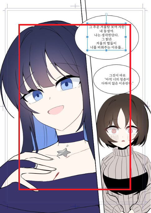 저거 재단선 넘겨버려서 실제로 출력할 땐 그림 많이 잘릴 거 같어. 내가 표시한 빨간색 네모안엔 중요한 그림은 다 들어갈 수 있도록 줄이는 건 어떰?