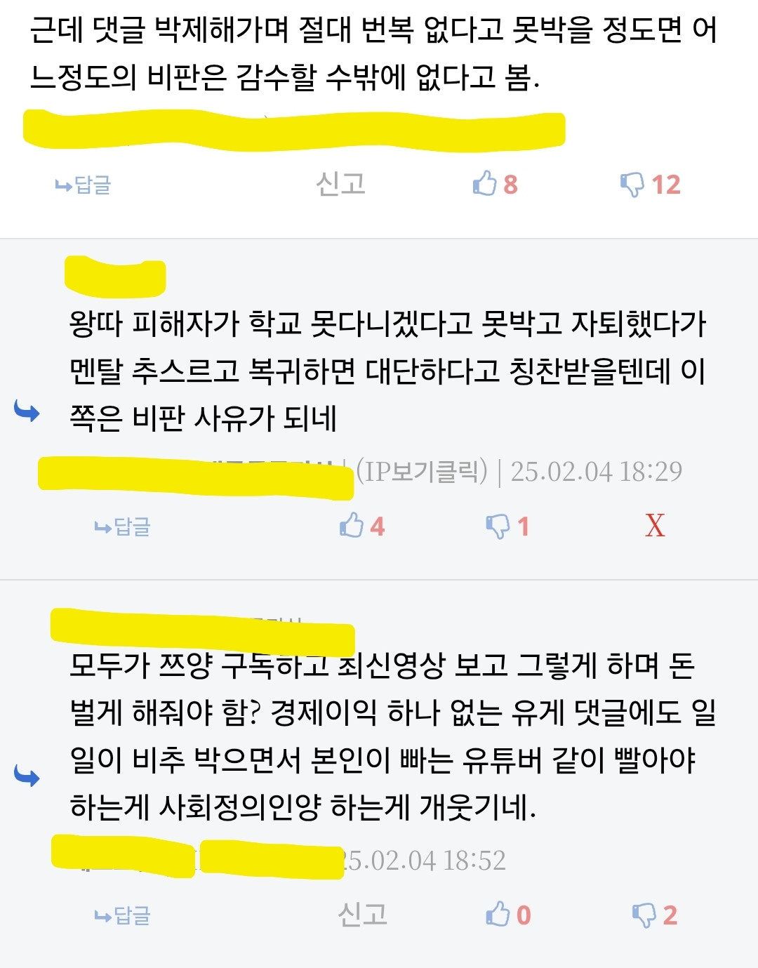 근데 은퇴 번복이 그렇게 까지 증오 해야 할 일인가 싶응데 어차피 유투버는 보는 사람만 보는 것일 뿐 | 25.10.14 16:22 | | |