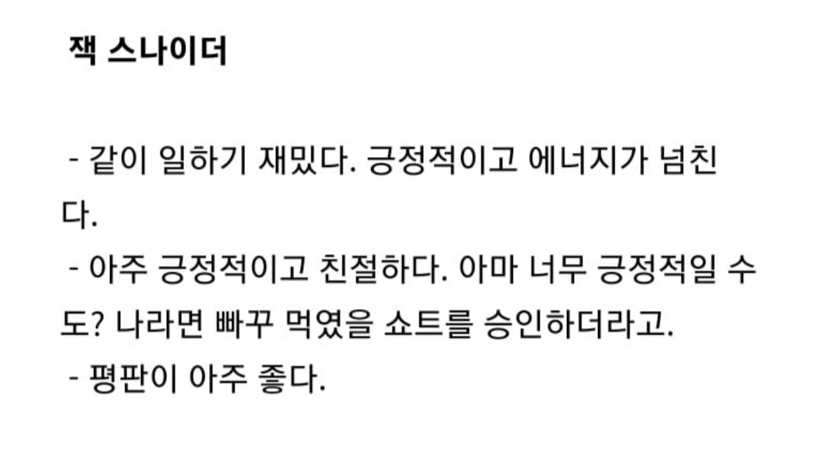 잭스나이더 영화는 잘 만듬. 그런데 남이 고삐를 잡아줘야 하는 느낌이지. 그런 사람 있짆음. 남의 일 해주는 건 엄청 잘 하는데 자기가 처음부터 해야하면 애매한 사람들. | 25.10.14 17:37 | | |