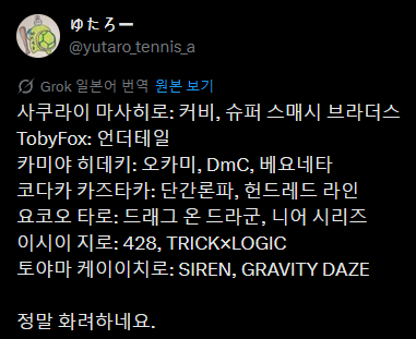 요코오 타로도 나무위키 쳐보면 사진 나오긴 함. 만드는 겜에 비해 둥글둥글하게 생겨서 가리는거라고 | 25.10.14 18:35 | | |