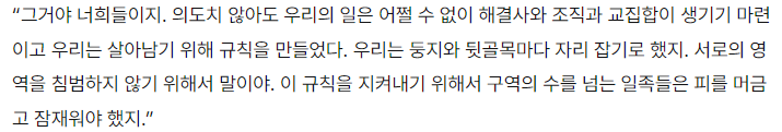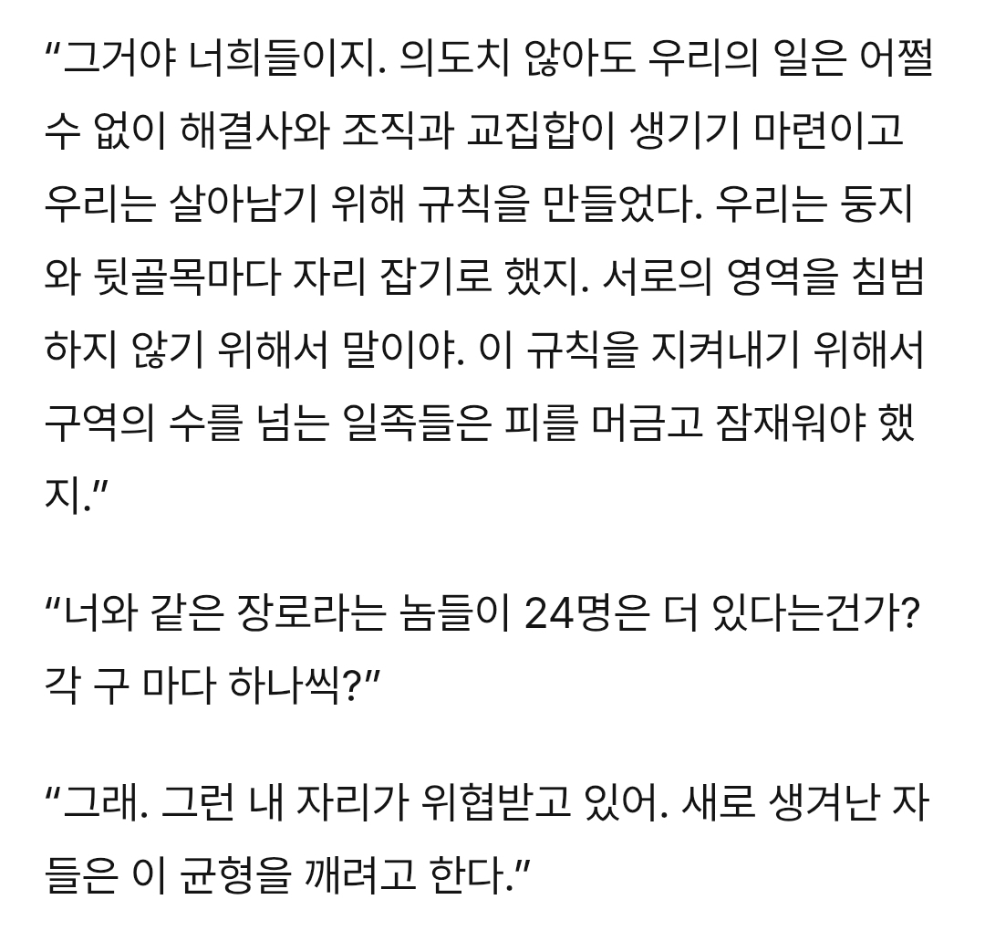 저 말을 하고 있는 당사자가 장로에요.. 우리라고 했고.. 둥지와 뒷골목 마다 자리 잡는다고 듣자마자 모제스가 바로 24명 더 있냐고 도출하는 시점에서.. 장로=구역 담당자 라는 의미로 받아들이고 있지 않을까..?; | 25.10.14 21:41 | | |