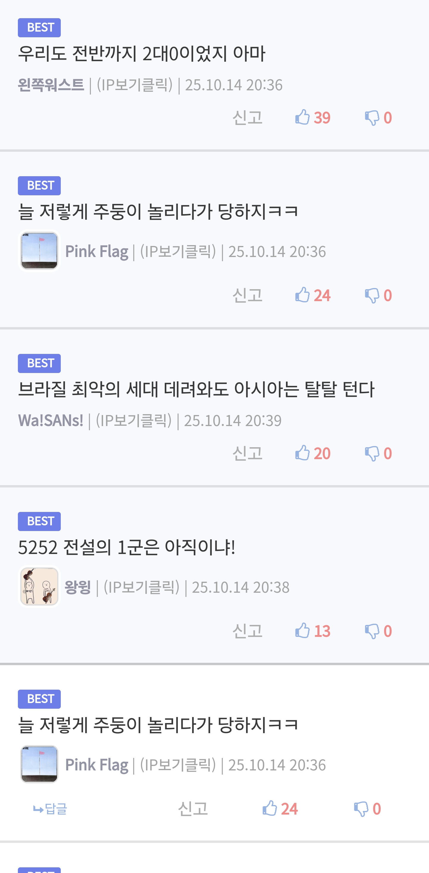 젠장!! 역전까지 할 줄은 몰랐지...끽해야 한 골 넣으면 다행이겠지 했는데... | 25.10.14 21:14 | | |