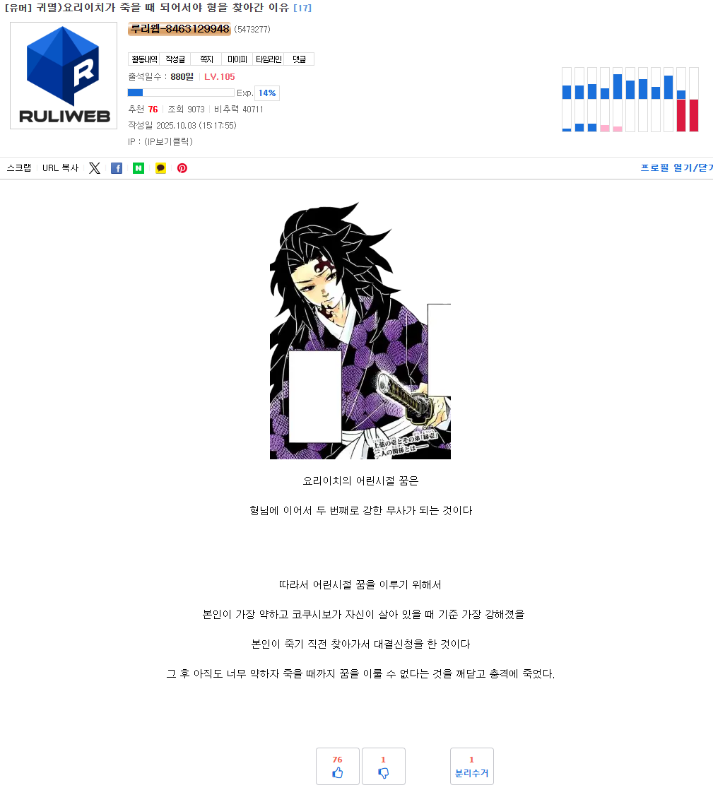 요리이치 빼면 인간 중에는 거의 최강 아닌가? 요리이치 부모는 인간 중 최강 둘을 낳았는데 | 25.10.19 14:48 | | |