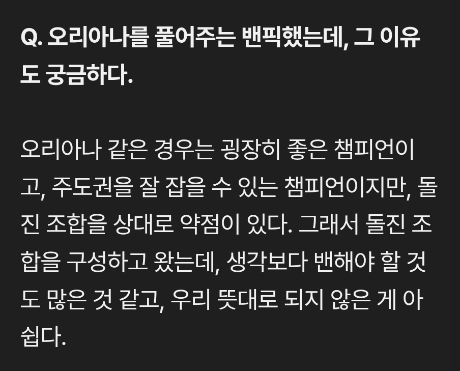 이번 년도에 팀적으로 카이사 낀 돌진 조합 성립된 게 없는데 평소 잘 하던 뽀삐+자야 라도 하지 밴픽 진짜 이상했음 | 25.10.19 19:00 | | |