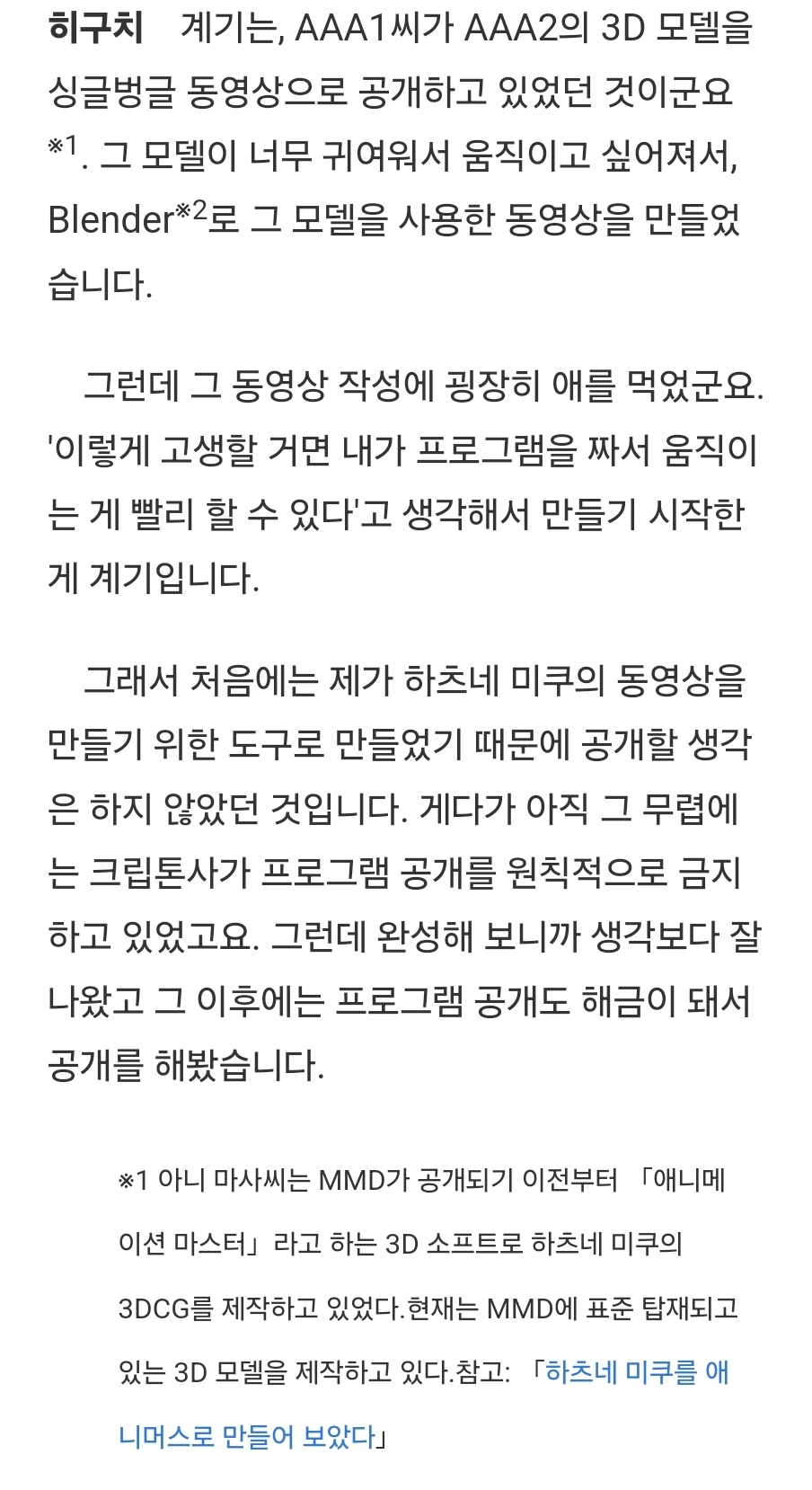 안그래도 찾아보고 있었는데 미쿠 영상 만들려고 블렌더 건들다가 때려치우고 만든거라서 글케 됐다하네ㅋㅋㅋㅋㅋ 거기에 처음 제작했을땐 저작권 가이드라인에 없어서 크립톤에 연락해서 문의까지 했더니 가이드라인이 갱신되어서 공개했다고ㅋㅋㅋㅋ 하나 아쉬운건 08년도 당시 인터뷰? 내용이 빈약해서 첫 개발부터 프로젝트명을 미쿠미쿠댄스로 했었는가 아니었는가는 알수가 없었던게... | 25.10.21 03:45 | | |