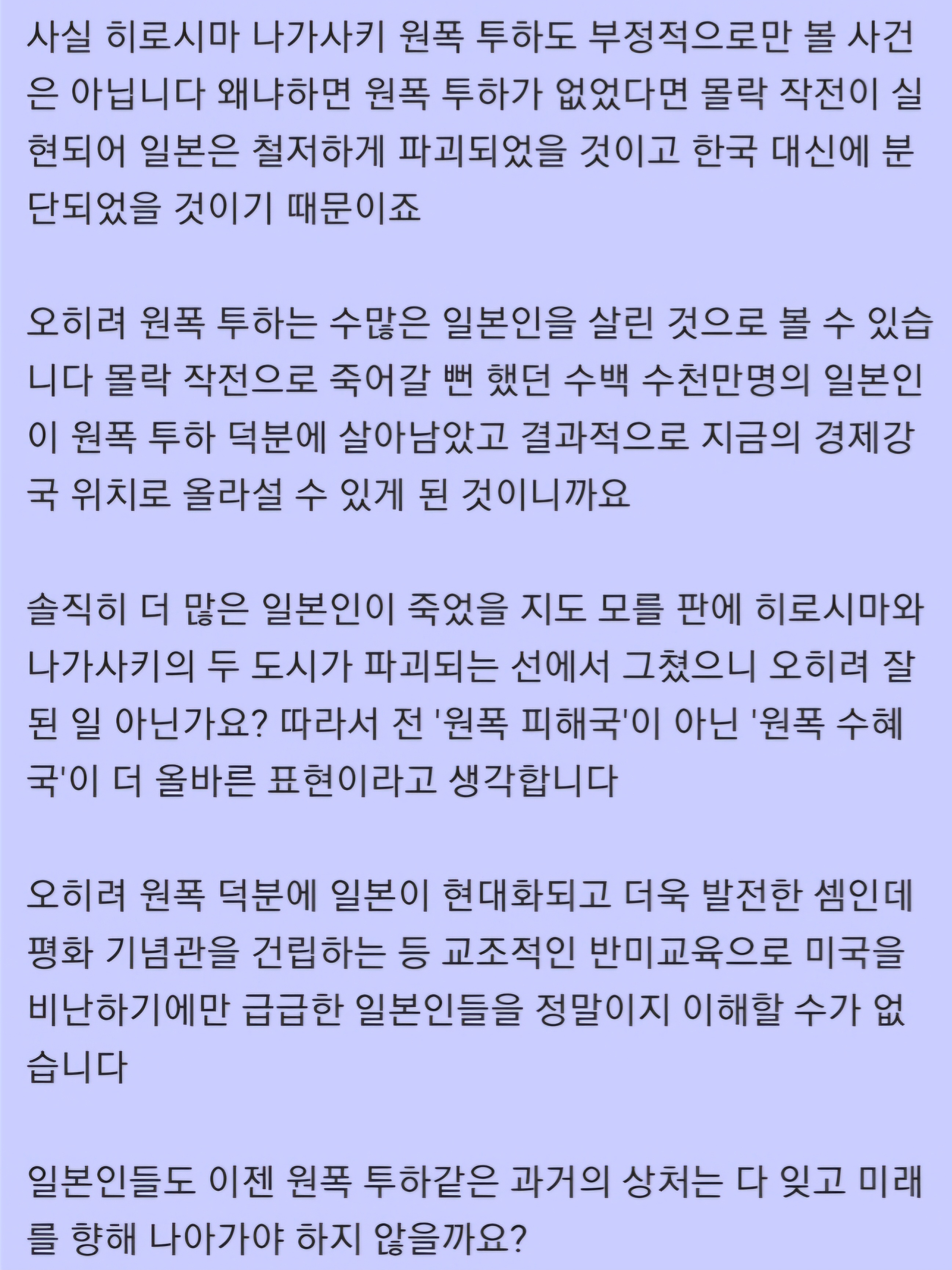 핵 사용된거 그래 백보 양보해서 안좋은일 맞다 쳐 그래서 당시 피폭되고 사망한 한국인은? 할때 회피하거나 입꾹닫하면 그때 줘패도 늦지 않음