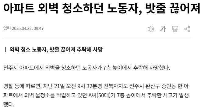 이전에 누가 일부러 줄 잘라버려서 추락사한 사례도 있었는데ㄷㄷㄷ | 25.10.25 13:59 | | |