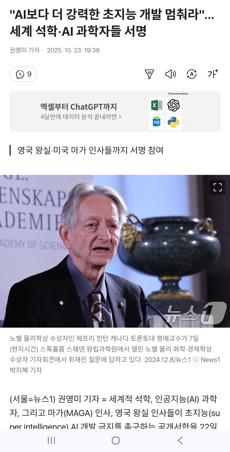 이거는 뉴스 전문까지 보면 '개발하지 말자'가 아니라 '소수기업이 독점하는 방식은 안된다', '안전하고 통제가능한 방식으로 개발되어야 한다'에 가깝던데. 당장 저기 서명한 제프리 힌턴 교수도 ai발전에 안전성이 있어야한다는 신중론자라 국제적인 안전 규제가 필요하단거지 발전 자체를 부정하진 않고 | 25.10.25 15:16 | | |