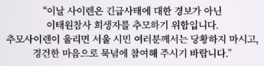 취지는 좋은데 서울전역은 너무 광범위 하지 않나 그냥 이태원에서 울렸으면 참가자나 주변 사람들도 다 이해하고 자연스레 할거같은데 좀 범위가 과하게 넓은거 같은데