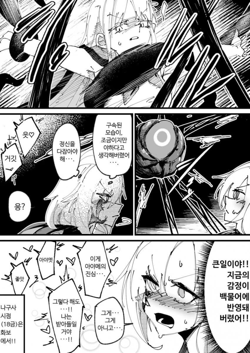 겨우 혀놀림으로 아야메의 평정을 흔들고 그에 촉수 구속으로 화답하는 아야메 ㄷㄷㄷ '널 한번이라도 친구라고 생각한 적 없어' 그렇구만 친구가 아니었구만...